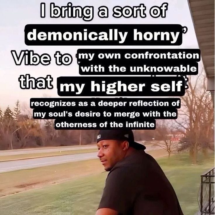 In fairness, though, everyone seems to be doing some version of this. We’re living in an era of extreme want - to be hotter, more locked in, more aura-maxxed - while simultaneously in an age of extreme deprivation. Celery juice at sunrise. GLP-1 at lunch. "Low dopamine mornings and high-protein evenings. It’s not asceticism; the goal isn’t enlightenment. It’s just a way to raise our market value.
