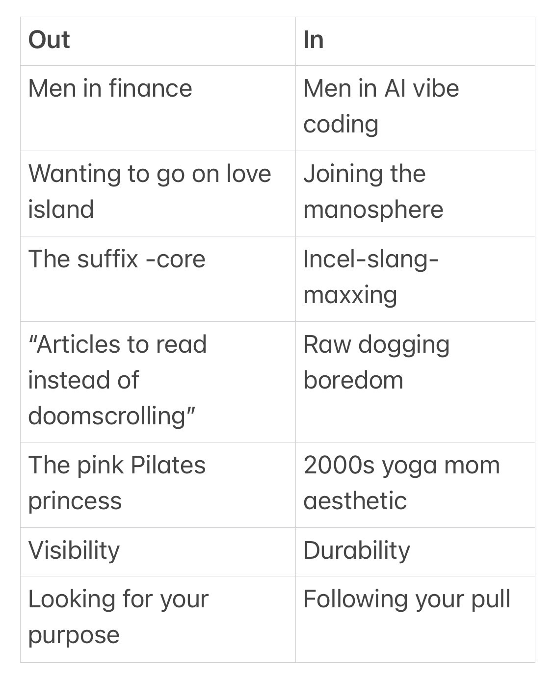 I haven’t done one of these for a while because I saw a video where Charli XCX said “In and Out lists” were out and I got a bit self conscious, lol. But then I remembered that loads of publications posted that Brat Summer was dead and she came back with a whole second remix album and a film. So in that spirit, here are some long-overdue outs and ins…