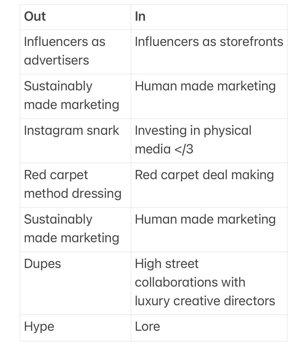 Disclaimer: this isn’t (for the most part) a taste-based in/out list. It’s a read on changing consumer behaviour, retail dynamics and marketing trends - what’s gaining ground, and what’s falling away. I do not condone all of these developments.